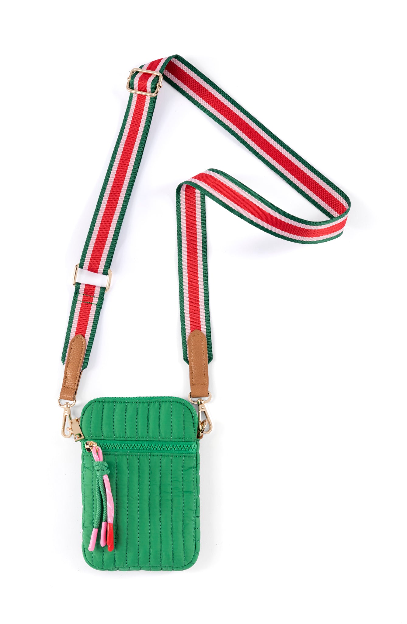 Say hello to the Ezra Phone Holder—your stylish solution for carrying just the essentials without the bulk! Made from the signature quilted nylon, this compact crossbody keeps your phone, cards, and small must-haves secure and easily accessible. Featuring a zippered main compartment, a front pocket for extra storage, and an adjustable striped strap for a sporty-chic vibe, this bag is ready to go wherever you do. Whether you're running errands, heading out for a coffee date, or traveling light, this sleek and functional bag has you covered.